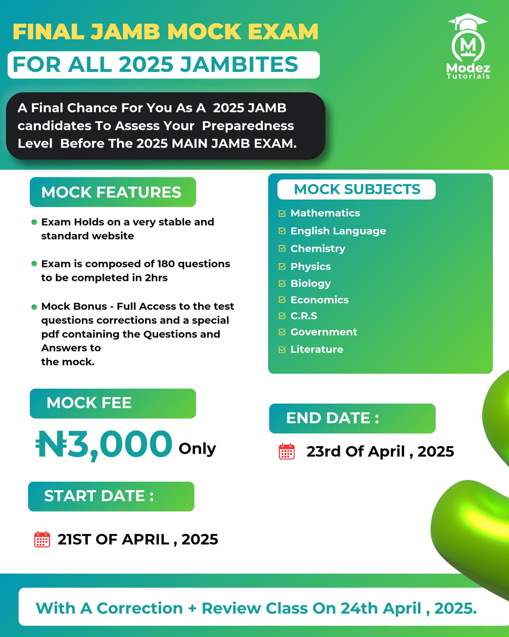 Our 2025 FINAL JAMB REVISION class at Modez Tutorials will begin on April 7th, 2025, and we are excited to announce to all parents, guardians, and students that payments can now be made for With Different Options!Keep Reading !