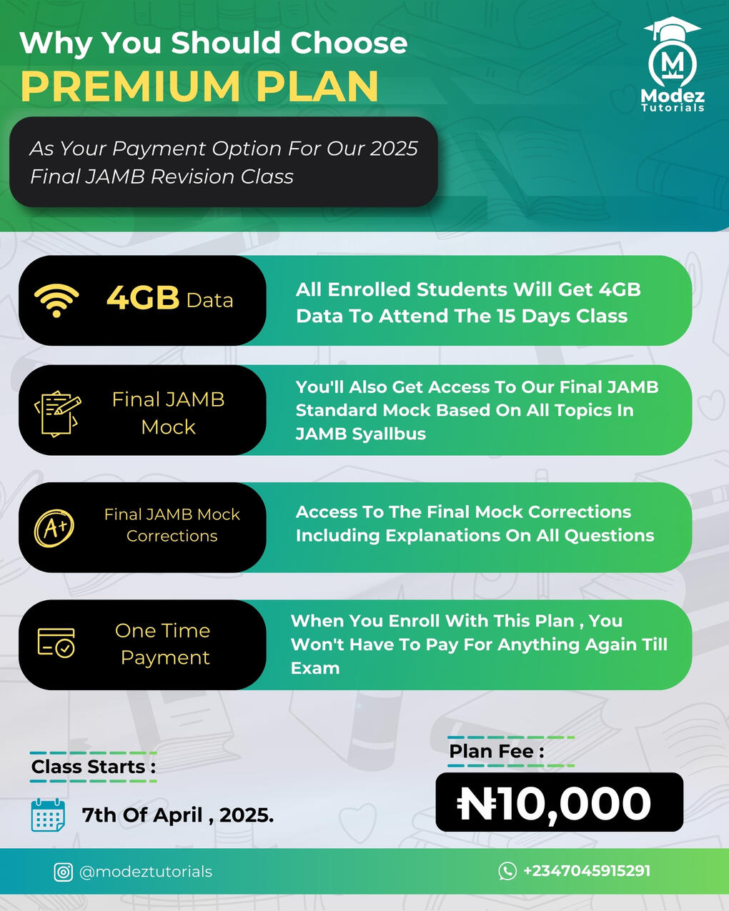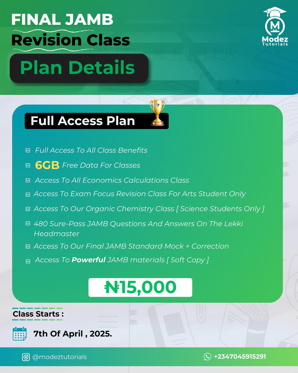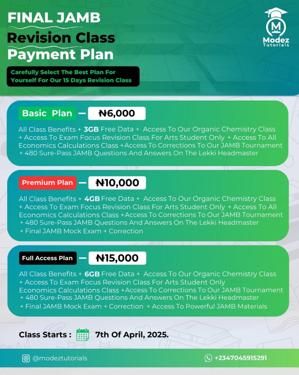 MODEZ TUTORIALS 2025 FINAL JAMB REVISION CLASS PRICING PLAN